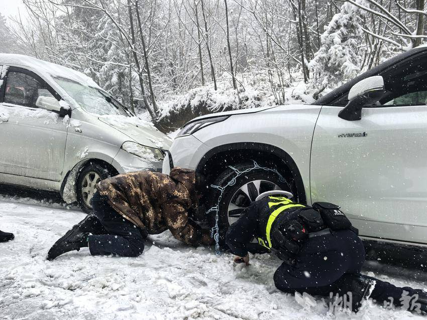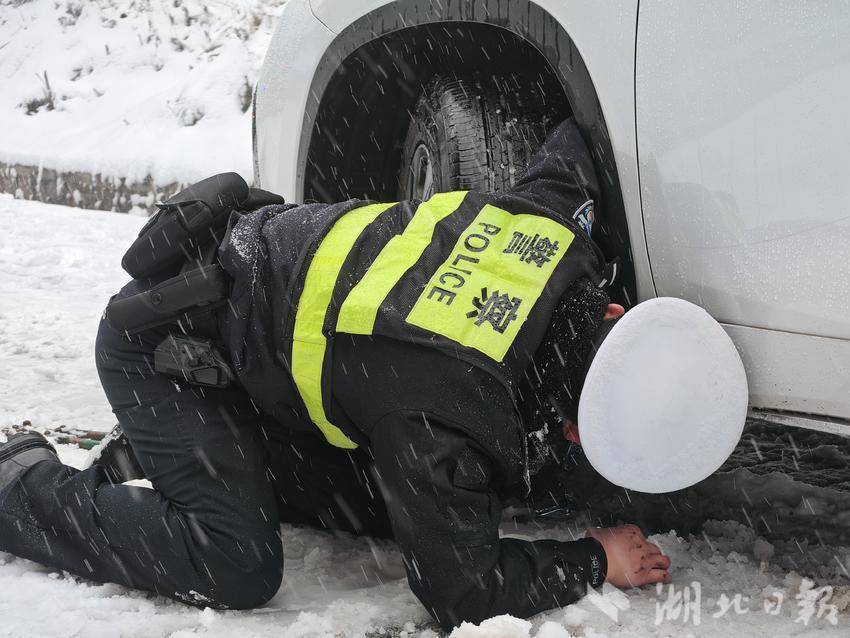 我们从恩施城出发,见到张金星的时候,他正和同事牟卫明在恩川线大山顶村路段上帮一位外地游客的轿车安装防滑链,由于轿车底盘较低,他不得不用膝盖跪在雪地上,一只手撑着地,身体趴着,用另一只手探进前轮内侧,摸索着将防滑链靠内的部分挂稳,确定稳妥后再起身固定轮胎外侧的防滑链,并用液压钳剪断长了一截的链条。此时,雪势还没有减弱的架势,冷风裹挟着雪花砸在他的警帽、警服上,白了好一片,裸露的双手糊满雪水和泥泞,被寒风刺得通红,但他似乎全然不觉。